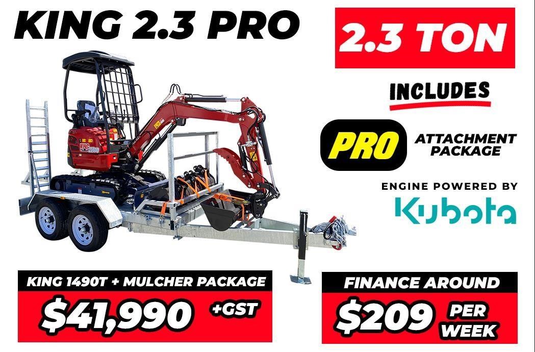 The Digger King 2.3 King Pro Package - 990mm wide, expands to 1240mm Includes Pro Implement Package Do you have property you need to take care of? The 2.3 King Pro excavator gives you the speed to do the jobs fast and with no hassles Maybe you have a hobby farm, you make some extra $ on the weekends, you know you can make more money and you just need the right digger to do it? Has your current digger given up the ghost or is barely performing? You want a new one but don't want to spend huge $ on a brand name that, when it comes down to it, you are just paying for the brand and not much more? If you answered yes to any of the above questions, then we have great news: The 2.3 King Pro digger is here so you can get your jobs done. Our turnkey The Digger King 2.3 King Pro is truly an amazing machine and probably just right for you. Our 2.3 King Pro includes all our standard features of the 2.3 ton, plus the King Pro implement package: 3 cylinder Kubota Engine Swing Boom 200mm Narrow Bucket With Teeth 400mm Standard Bucket With Teeth 600mm Batter Bucket 1000mm Mud Bucket Ripper Claw Hydraulic Thumb Hydraulic Quick Hitch 12 month parts and labour, 36 month parts warranty 2.3 King Pro Excavator and Implements Package Total Price Only $34,990 + GST or around $179 per week on finance 2.3 King Pro Excavator and Implements Package Inclusions: Easy to apply, no deposit and financing available- The Digger King 2.3 King Pro from just $179 per week, all done via experienced finance teams that search for the best deal for you. From the first day you own your new digger, no dodgy overpriced rent-to-own options Able to dig down to 2150mm - this means most trenches will be done with ease Large deep grip tracks- this allows you to grip in the most sticky situations Small Operating area - this allows you to access areas easily Easy to use controls - this means it is simple to operate 2490mm maximum height - means you can load trucks or pile things up higher and easier Easy to operate and accessible controls - Operate your 2.3 King Pro in comfort Reliable and strong - your 2.3 King Pro is built strong, as strong as bigger brand name diggers but without the price tag 3-minute on pre start check - yes, simple and easy to access, walk around, check oil, water and attachments in 3 minutes or less King comfy seat - this gives you comfort when operating all day Easy clean floor - getting mud off the floor is easy, clean with no hassles Quick release bucket - adds to the speed, if you need to remove the bucket it is fast, easy with no fuss Adjustable level blade - you can adjust and level out ground in front of you All round vision - nice and handy to see around you when backing up High grip handles - walk in and out easily with a high grip handle within easy access; this means even on rough ground you can get back on board with no issues 12 month parts and labour, 36-month workmanship warranty - Your investment is safe and secure. If you have any dramas with workmanship on your digger or anything in your digger, let us know and we will sort it out as quickly as we can Dedicated after-sales help and support - 1300 direct line to our help staff. Got a question? We are happy to help Easy add-on equipment - Select from our range, we will fit it to your digger for you or supply your own and you can fit it when your digger arrives 2.3 King Pro Excavator and Implements Package Total Price Only $34,990 + GST or around $179 per week on finance MOST POPULAR: 2.3 King Pro Excavator, Implements and Trailer Premium Package Only $41,990+GST or around $209 per week on finance 2.3 King Pro Excavator, Implements and Trailer Premium Package Inclusions: Everything in the standard Machine and Implements package, plus: Super Duty Trailer with 4 wheel electric brakes and easy fold down ramps Implement rack Tie down straps All set up for you turnkey Add an optional auger with 300 mm bit for $2990 + GST 2.3 King Pro Excavator, Implements and Trailer Premium Package Only $41,990+GST or around $209 per week on finance Engine Engine Make Kubota Fuel Type Diesel Rated Power 18 hp (12.5 kw) Electrical 12 Volt Breakout Force 14.5 kN Hydraulic System Pump Brand Jinxing (USA Design) Valve brand Beifang (USA Design) Pressure 3190 PSI (220 Bar) Flow 39.6 L/Min Cooler Air Driving System Motor Brand Eaton (USA) Pressure 3190 PSI (220 Bar) Flow 32 L/Min Speed 3 Km/h Fluid Capacities Fuel 20 L Diesel Hydraulic Oil 18 L Engine Oil 2.8 L Specifications Load capacity - 300 kg Weight - 2150 kg Width - 990 mm - expands to 1240 mm Boom - Swing Dimensions - 3400 mm (L) x 990 mm (W) x 2380 mm (H) Warranty - 12 months parts and labour, 36 month parts warranty